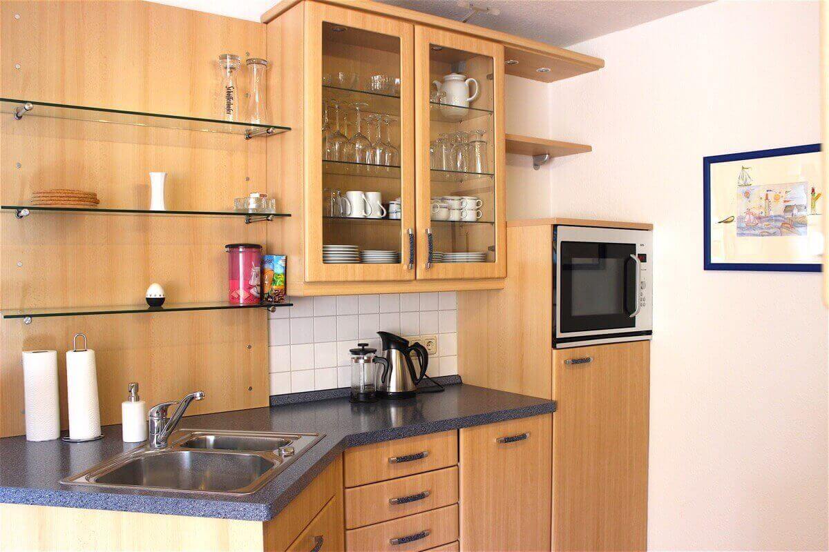 Die Küche ist modern ausgestattet mit: Kühlschrank, Spüle, Backofen, Herd (Cerankochfeld, 4-Platten), Spülmaschine, Mikrowelle, Kaffeemaschine, elektrischem Wasserkocher, Toaster, Geschirr und Besteck sowie allen erforderlichen Küchenutensilien (von Streichhölzern, über Frischhaltefolie bis hin zur Fischbratpfanne). Zudem steht eine Grundausstattung mit Reinigungsmitteln und Reinigungsutensilien bereit.